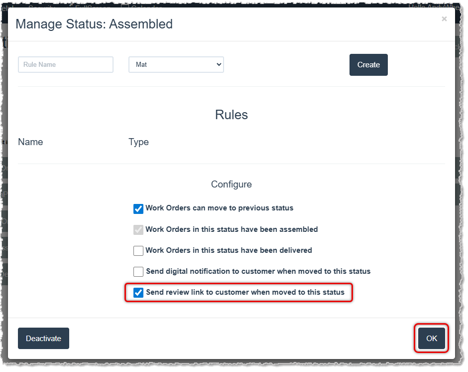 With the Messaging Assistant you are able to automate sending a text or email your customers when the status of their work order changes. There is a setting with each status so you can choose which statuses you want to send updates. The most common use case will be enabling this setting to send notification when an order moves to the Ready For Pickup or a similar status.